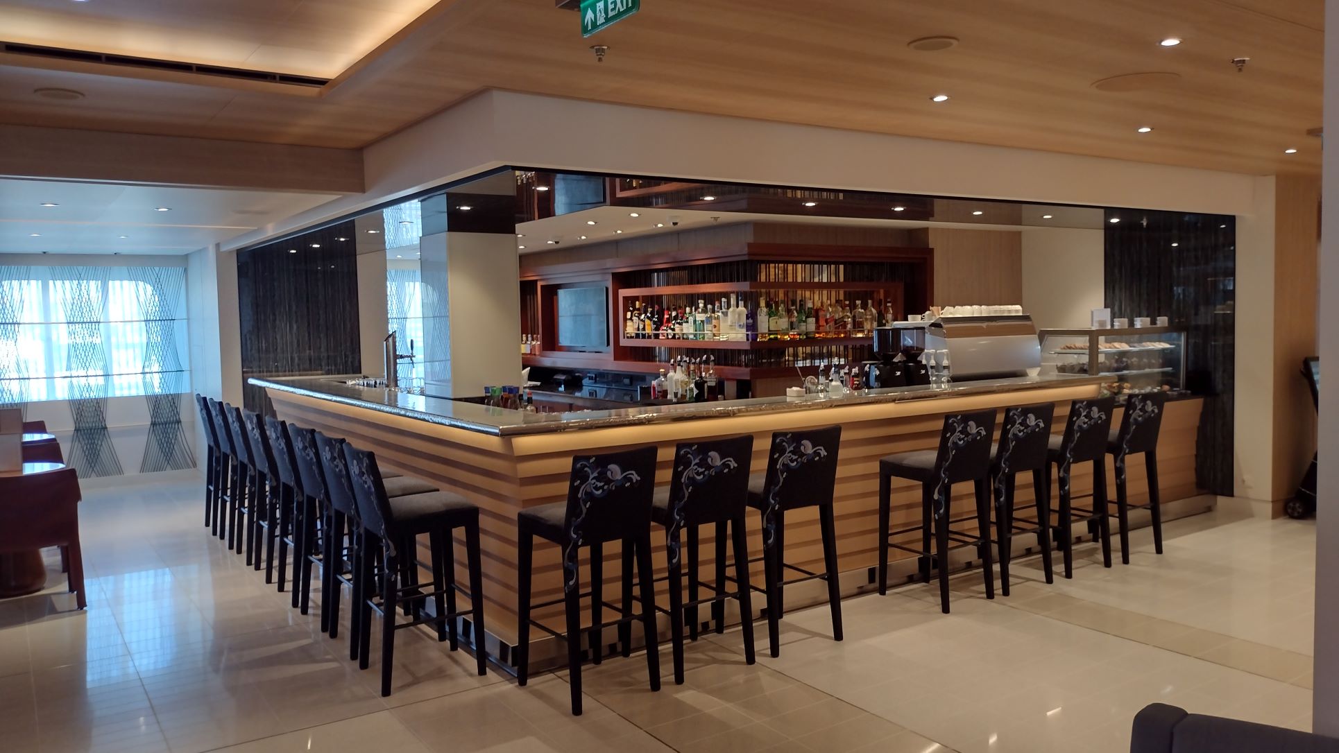 Shore excursion has a small stand there, for meet & greet, but for more indepth issues they take you to one of the Guest Services desks. Diagonally opposite is the Bar, a combination of a coffee and cake stand and a regular bar. I think it is located in this corner to be next to the Gangway, so guests can pick up a coffee before going off the ship or have a drink when coming back after an exhausting tour. Then late afternoon it changes more and more into a bar and there are always 20 – 30 guests present. By 18.00 hrs. the cocktail crowd starts gathering before dinner, for cocktails and to listen to the Resident Pianist or the Classical duo. (The latter alternate between the Livingroom and the Explorers lounge)
