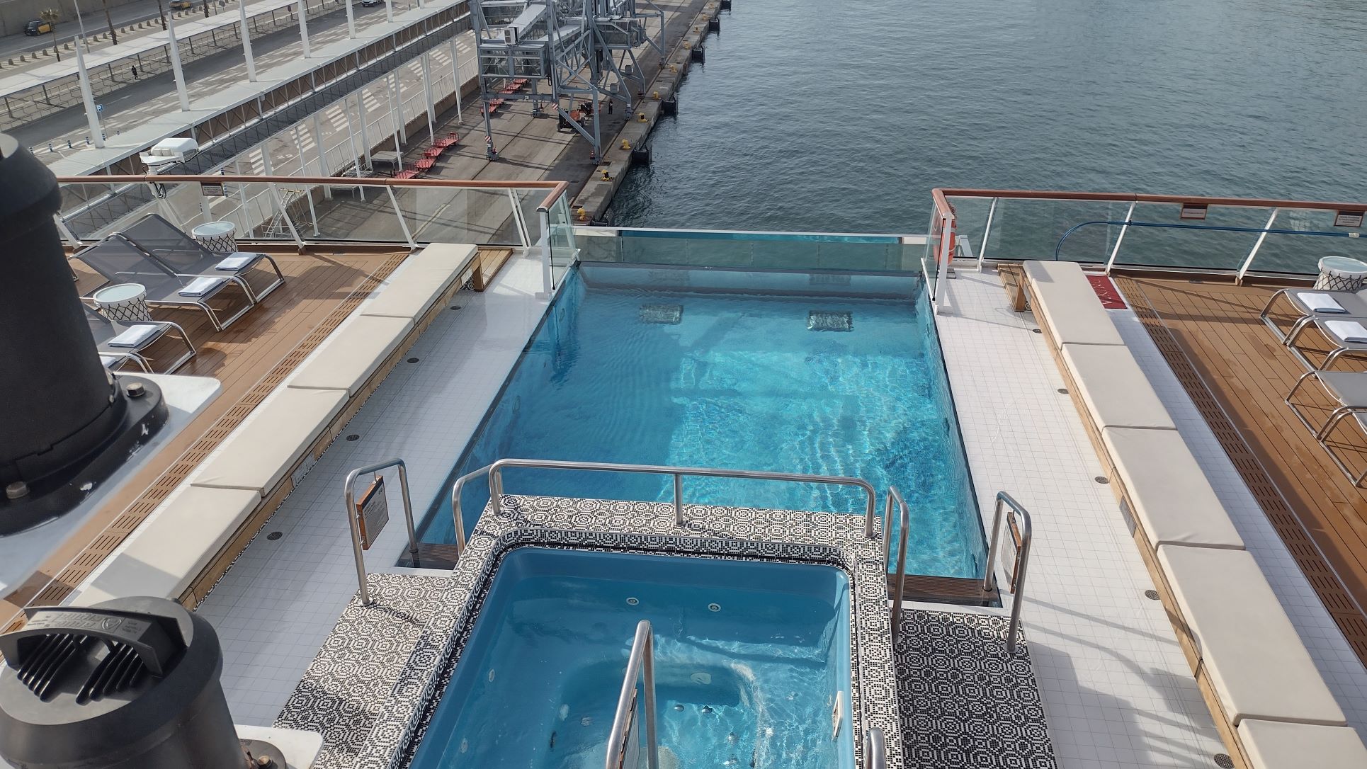 Behind it all, another bar, which is very busy as softdrinks, beer and wine are included at lunch time for everybody. (Same as Saga and Fred Olsen and also most 6 star company’s) Then there is an outside terrace, called the “Aquavit Terrace”, which today was in use as it was chilly but sunny. The stern of the ship has a infinity pool with in the front a jacuzzi. To stop the Infinitiy pool water from raining down on the balconies below, there is a sort of box hanging under it. This makes the ship look a bit weird from the outside. The first time I saw it, I thought it was some sort of cherry picker basket for cleaning windows.
