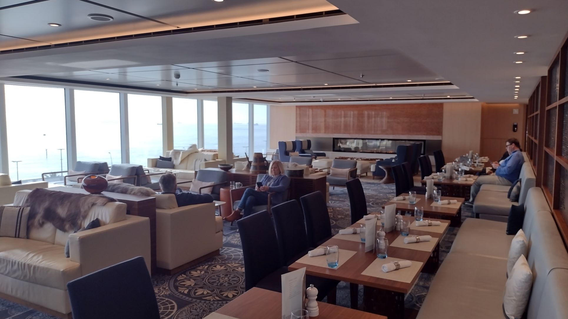 The centre of the ships is “The Atrium” but is also called “The Living Room”. (Saga Cruises has a similar concept). It is mainly a lounge to sit and relax, especially on level 3. There is no library but there are bookcases full (with very high quality books) in every corner and on every level. As well as in other lounges like the Explorers Lounge (crowsnest) on deck 7& 8). Game corners everywhere integrated as a part of the overall concept. And the game corners were very busy, especially with guests travelling together and who enjoyed time together before the afternoon tour or after the morning tour.