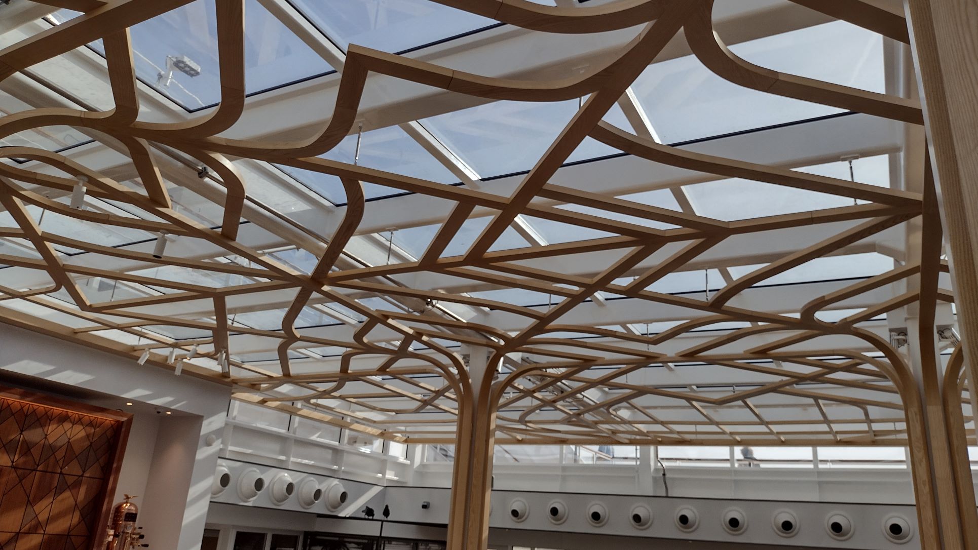 The “ceiling” of the Wintergarden. Nordic pine made to resemble a forest. I wonder if the birds would like it when the Dome is open.