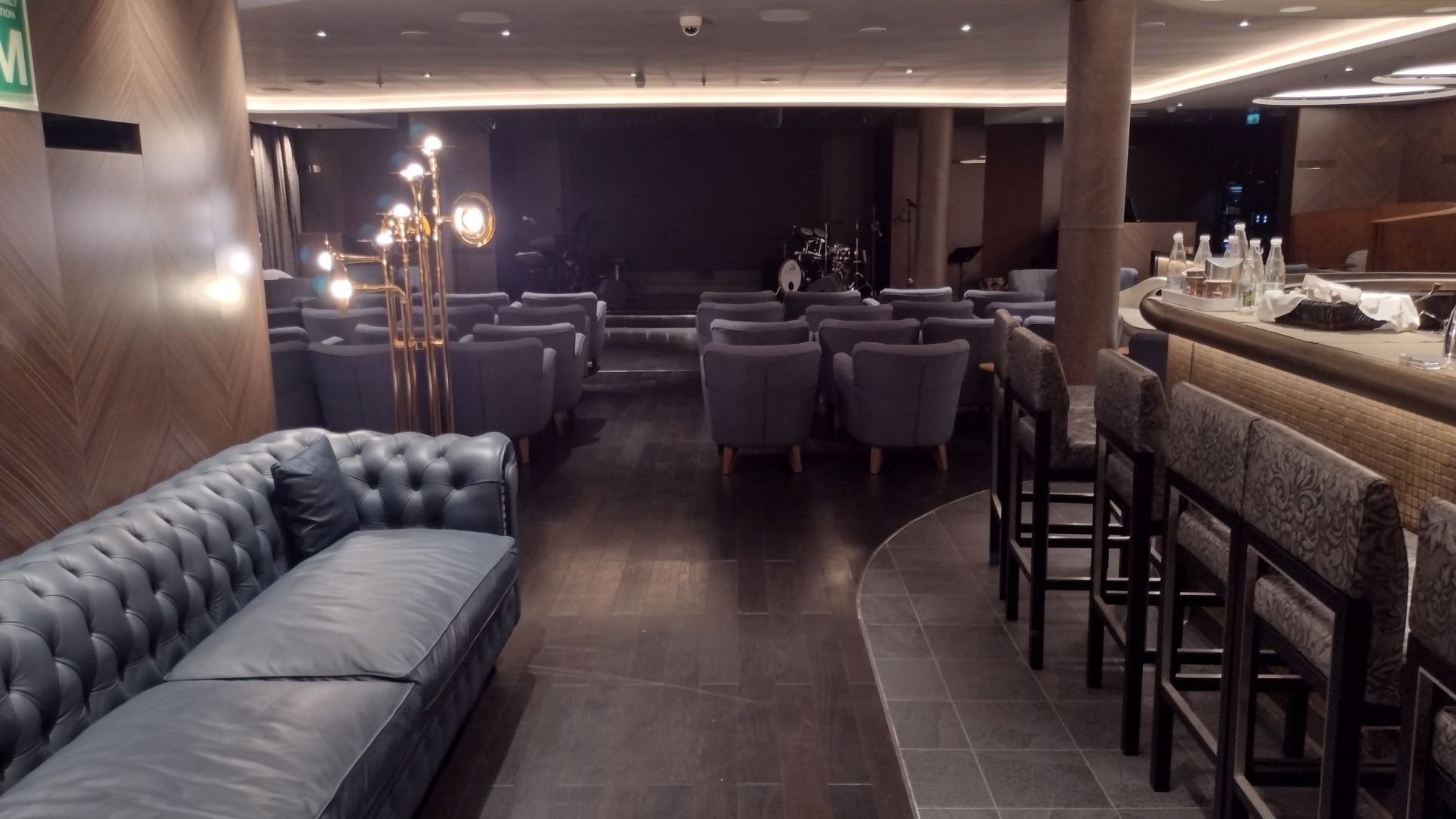 The Torshavn night club as seen from the entrance. The light stand on the left is fabricated in the shape of trombones. Not original as Holland America has the same one on board on the ss Koningsdam since 2016.