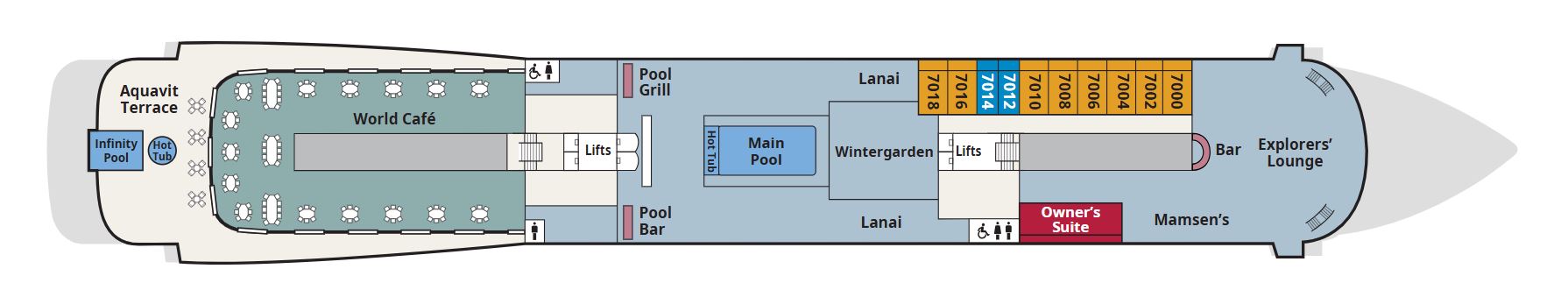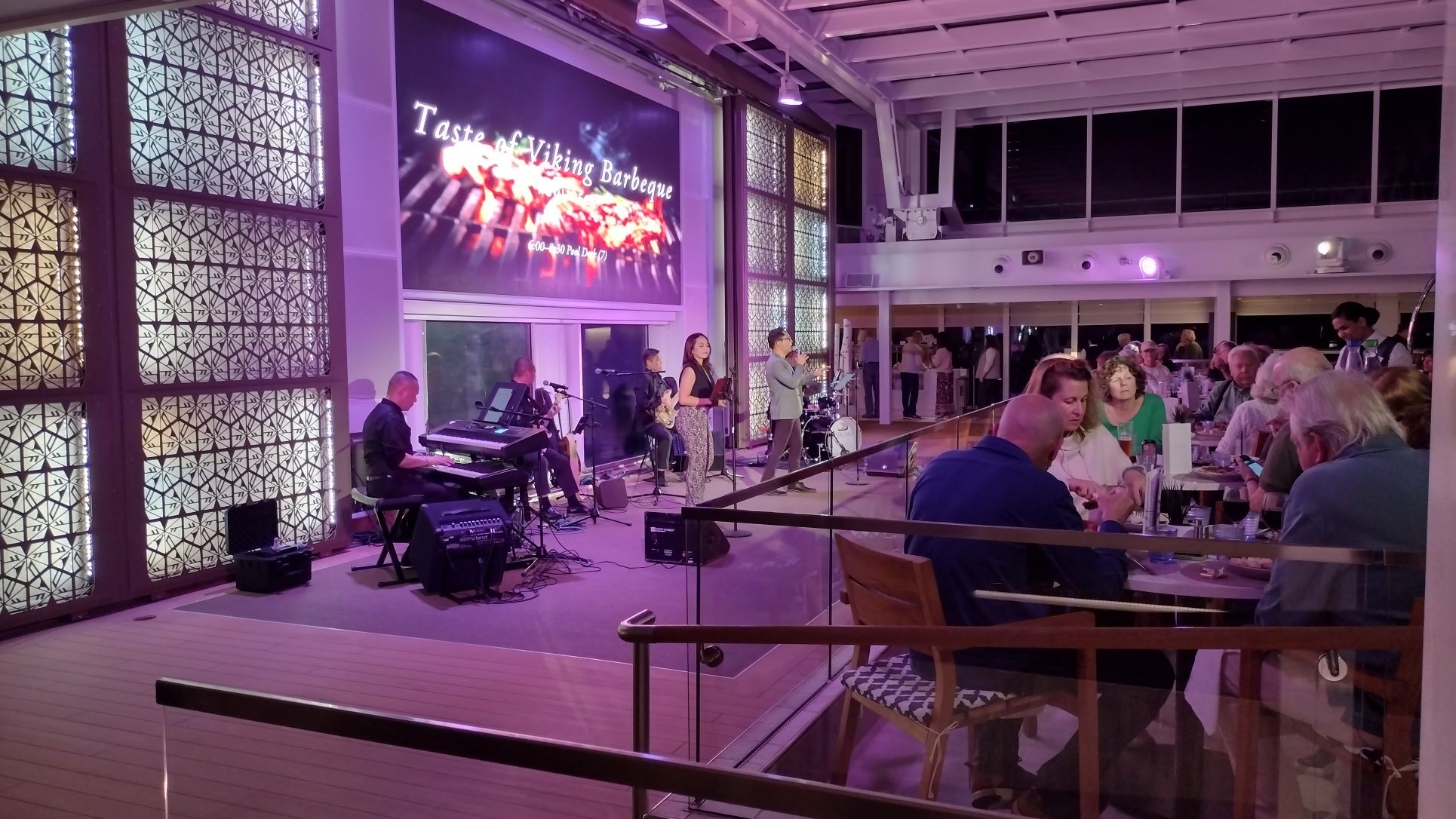 For cocktails we went back to the Explorers Lounge and then to dinner. The company had laid on a barbecue and dancing on the stars on Deck 7 under the Magro Dome. We went to have a look, but the barbecue was very limited so most people got extra from the buffet inside. It turned out that the dancing under the stars was not a continious party but more like a show where the various entetainers all did their own little thing. As (with the dome closed) the music was deafening we decided to go for a regular dinner. This BBQ gig did not get much of attendance as there are not many high tables around the pool, so one would have to hold the plate on ones knees. We are now spoiled by the “White Night” with Azamara, so this was a bit of a let down in comparison.