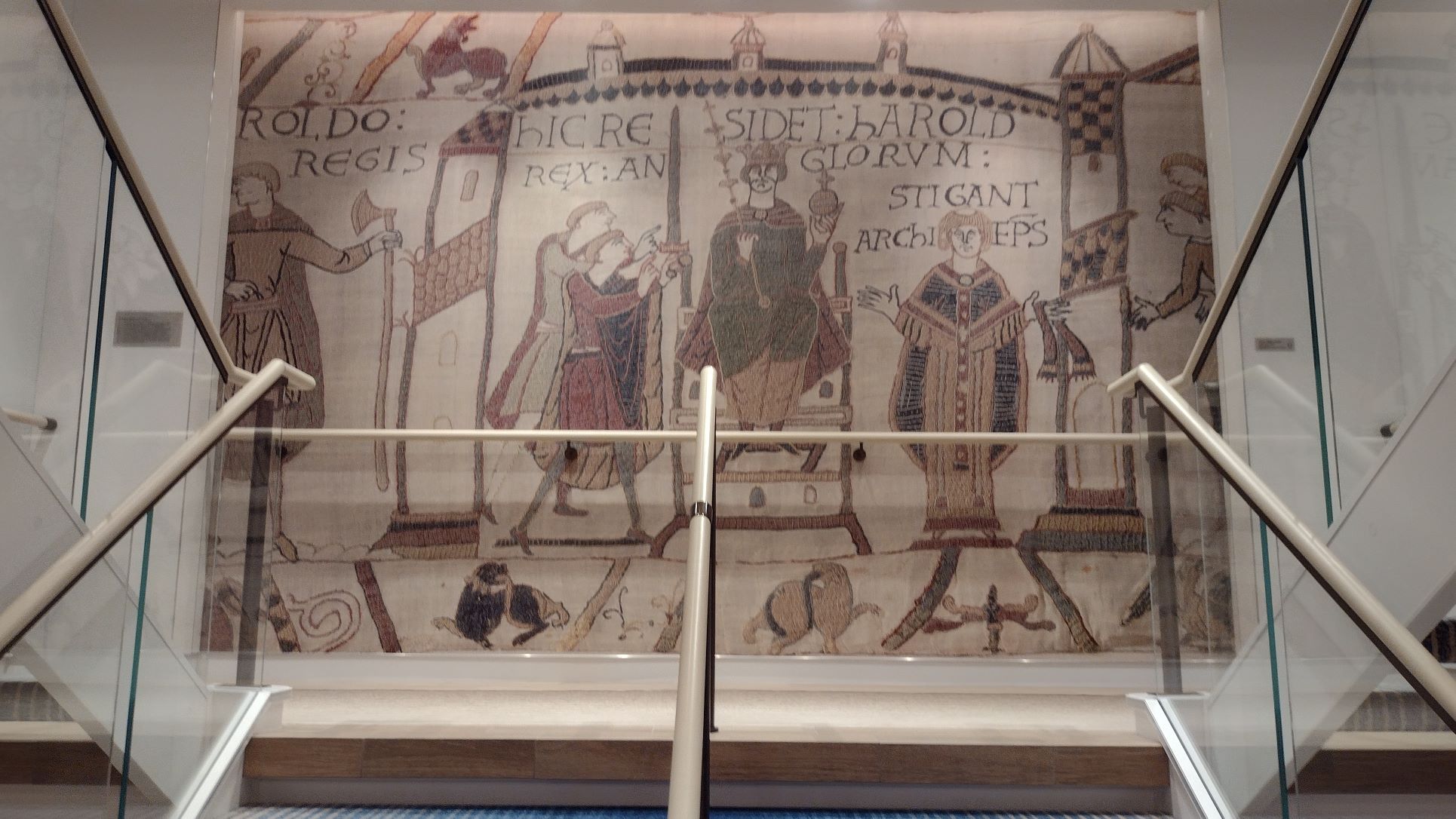 The blank bulkheads in the forward and aft staircases are covered with scenes taken from the Bayeux tapestry depicting the Normans (Norseman or Northman or Vikings) coming from Normandy, France, led by William the Conqueror in 1066 and defeating the English/ Anglo Saxon King Harold at Hastings.