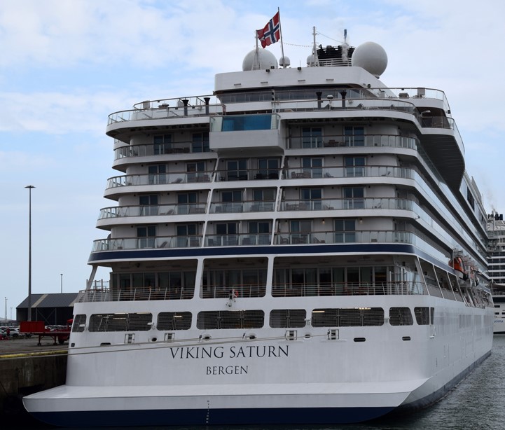The stern of the Viking Saturn. On top the Norwegian flag, as Viking is the last cruise company to have Norwegian registration which must be costly. Under the flag, the “Infinity pool water catcher box” under the deck 7 pool. At the water line, the “duckfoot” an extension with a dual purpose, it improves stability as it increases the surface size of the ship and also it inproves fuel economy as it acts as a “spoiler”, which you often see at the back of sports cars. (Photo courtesy, somewhere on the internet)