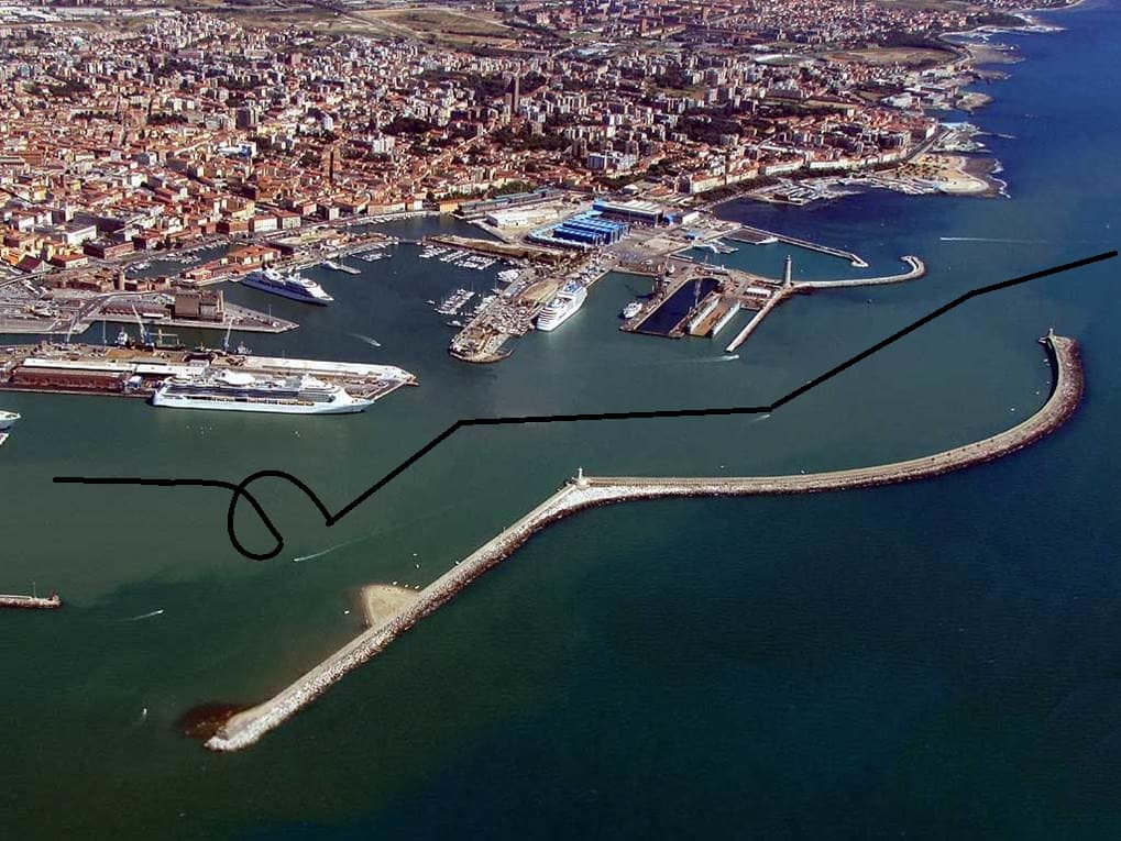Air photo of Livorno port. The black line is the track that most cruise ships follow, hardly any other way to do it as the port is large but very compact. Photo courtesy: Capt Alberts blog 17 Oct. 2018.