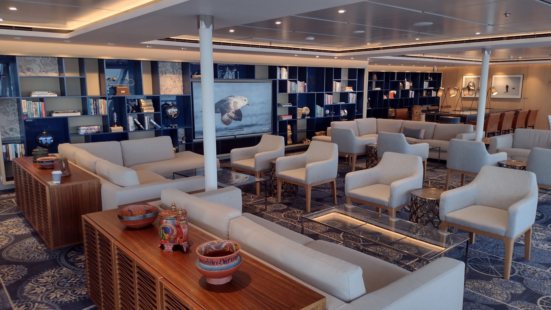 Deck 8, upper level Explorers Lounge. Mainly meant as a quiet study area with lots of books about exploration. Note all the books in the bookcase.They are all real and of high quality.