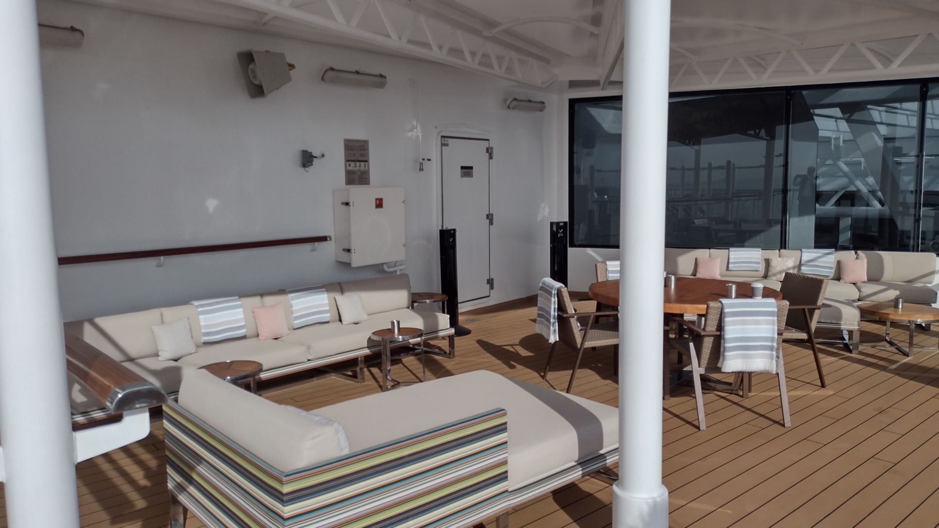 On deck 8 aft, carefully hidden away from the guests, is a black glass wall under the aft end of the funnel. Inside is a Officer / crew bar. A very clever setup and it would other wise have been a wasted space and there is also a hidden corner for smokers. For guest smokers there is a smoking section on the sb. side midships but I never saw it very busy.