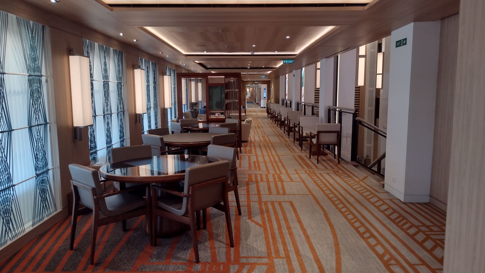 To my amazement it all works here extremely well, there is no noise, just the buzz from polite conversion with a tinkling piano in the background. The fact that the space is 3 decks high has no impact at all on the atmosphere. Where you walk the deck is marble but were you sit it is all carpet and thus no scraping noises and also no echoing noise.