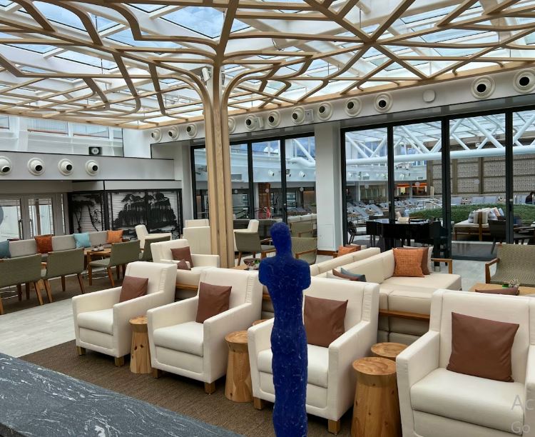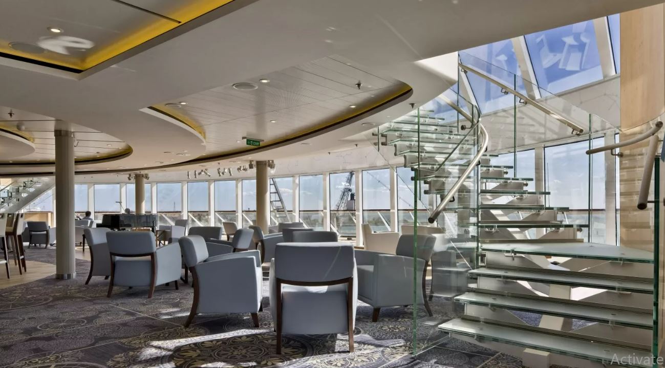Deck 7. All the public areas are on Deck 1,2, and 7. The Explorers Lounge is near the bow and has a 2nd level (deck 8) at the forward part which can be reached by a glass staircase. You can still hear the entertainment from deck 7 level but is somewhat quieter.