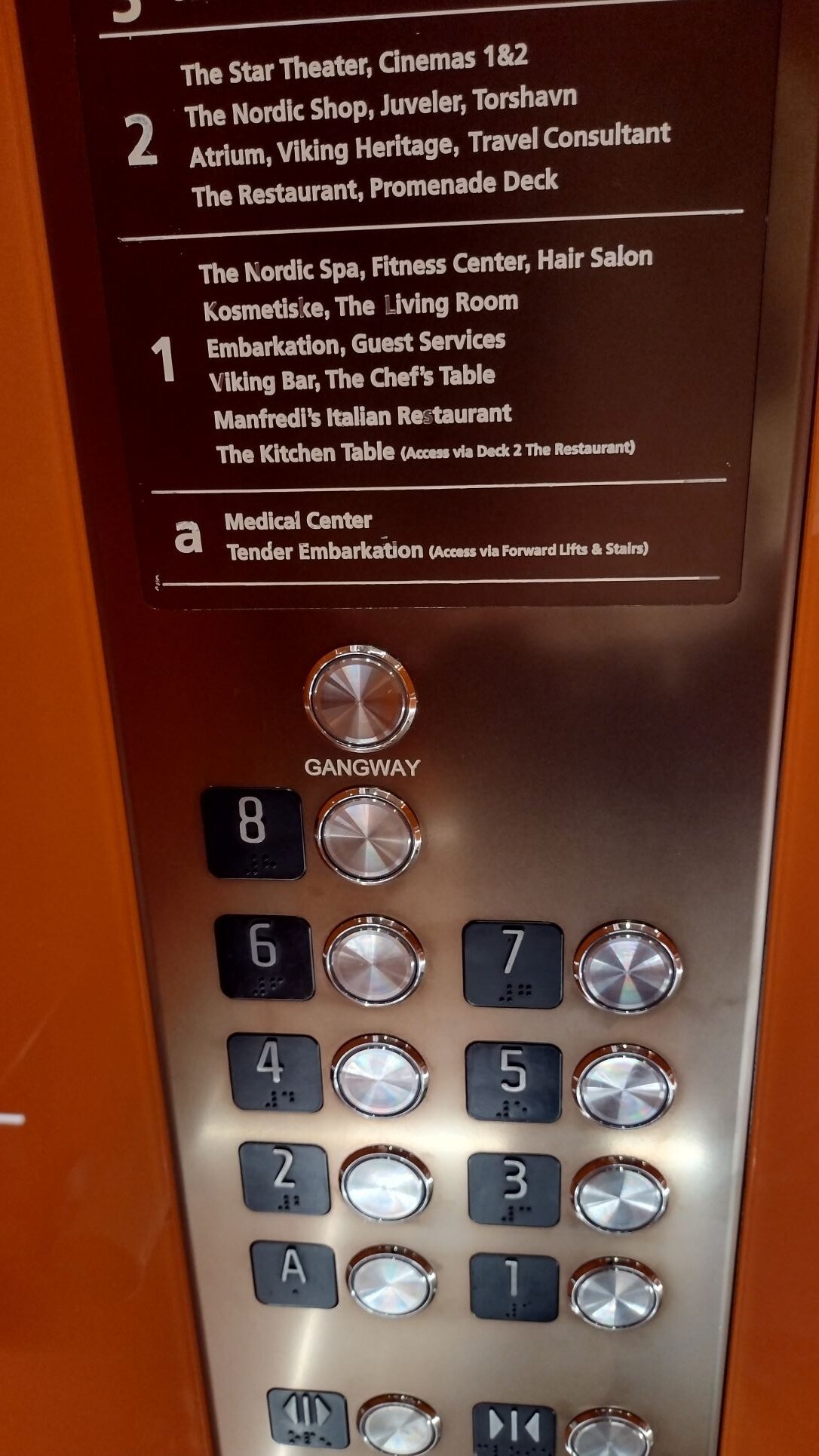 What I think is very cool is the gangway button in the lifts. When you do not know where the gangway is, you just push the button (above deck 8) and it goes to the right deck. I wish all ships would have that.