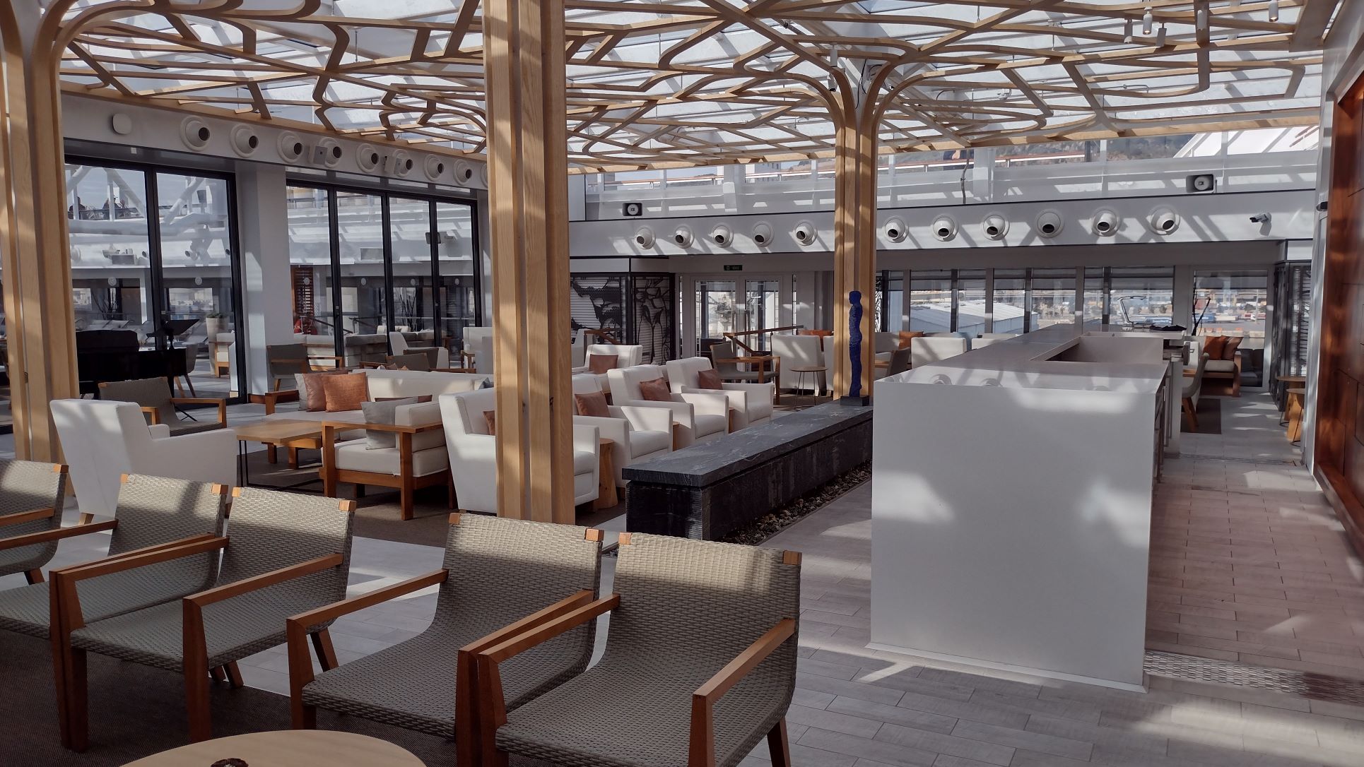 Then you get Deck 7 and 8 (outside deck). At the bow, is the Explorers Lounge with music in the evenings. The only thing that irritates is that the constellation display on the wall behind the bar, reflects onto the front windows and thus it is hard to see outside after dusk. But you can solve that by going up one of the 2 glass staircases to Deck 8, where there is no reflection. The music can still be heard as there is a gap with below.