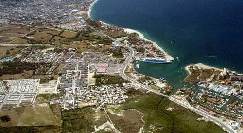 Aireal view of the port of Puerto Vallarta with berth no 1. occupied. Berth 2 is to the left and berth 3to the lower side of the harbour. The marina can be seen to the right.