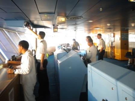 So this is the sailor that works on the bridge. Two for each watch. One for the lookout and one for the steering. In between they keep the bridge organized, the windows clean, the coffee fresh, keep the ship upright with the heeling pumps, check fire alarms, etc.etc. Napoleon once said, an army marches on their stomach, well the bridge stays awake with Coffee, tea and large quantities of peanuts. All supplied by the quartermaster. They come forth out of the Deck department and start off as Sailor O.S. (ordinary Sailor) which is a trainee sailor. He then makes promotion to Sailor A.B. (Able Bodied) as soon as the bo’sun decides that he controls all the aspects of sailor life. When capable and willing (not all sailors want to be a Q.M and watch four hours out of the window (*)) he can get promoted to QuarterMaster. Then he gets trained up in steering & the bridge equipment by the Officers and learns the rest from an older colleague with whom he is paired. When in port, the QM’s are involved with watching the mooring lines all day and keeping them tight. In between they carry out maintenance that is of a higher skill that what is done by the sailors. That includes varnishing railings (it is not easy to get three layers of varnish on a railing without leaving streaks) and also training the new sailors O.S. In general a skilled and motivated Q.M can make the life of the Officer of the Watch very easy. Further promotion is there as well, going to Storekeeper, Asst. bo’sun and finally Bo’sun. While in Hualtalco the Quartermasters were involved with keeping an eye on the mooring ropes as the low swell running in made the ship lightly move along the dock. They work 8 hours on the bridge when the ship sails and then 2 hours on deck. When in port, they do work off the bridge but can be reached by UHF when needed.