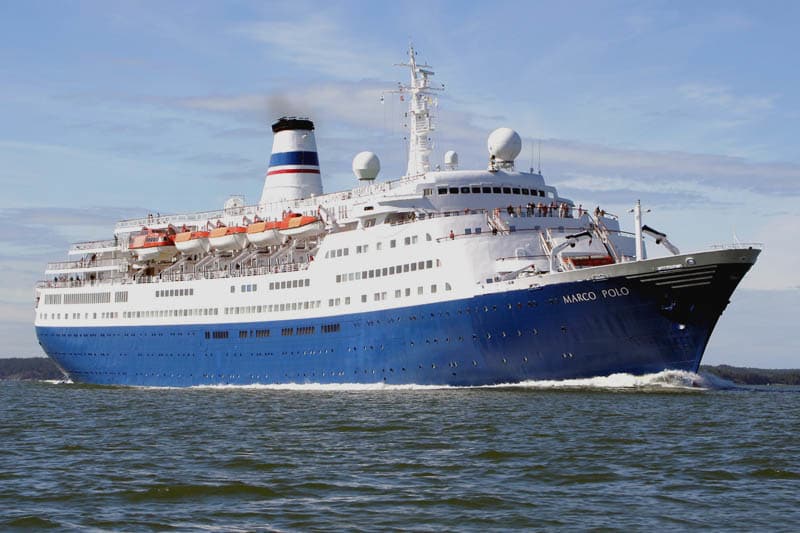 Half way down the river is the London International Cruise Terminal which is my back up plan in case Greenwich is not possible due to fog, to low a tide or the barrier being closed. Today this Terminal was in use by the Marco Polo, which sails in charter for a German company called TransOzean. Normally I ignore details about other non-HAL cruise ships but in this case I want to make an exception as this ship is a left over from the Trans Atlantic days. It was built in 1964 as the Alexsandr Pushkin for the Baltic Steamship Company for Trans Atlantic Liner service from Leningrad (now St. Petersburg) via the Baltic ports all the way to Montreal. Later she sailed in the Far East and ended up in 1992 in ownership of the Orient Line as the Marco Polo. This company became later part of NCL which ended the existence of Orient Lines in 2008. The ship was then bought by Greek Interest who have since chartered her out to a German Operator. It is only a small ship of 20,000 tons but is built in the more old fashioned way with a sheer and traditional lay out. A beautiful left over from another era. Further down the river we passed the container and tanker terminals until finally we ended up on the open sea again.