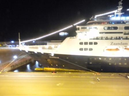 I read in the comments about how nice it would be if we would have Oosterdam, Zaandam and Statendam together. Well I am always trying to please; so see here, the three ships together. A photo shot from the Statendam, through the string lights of the Zaandam seeing the Oosterdam sailing by on the way to Seattle. This was 11 pm in the evening and the Oosterdam was on the way for a 05.30 docking in Seattle.