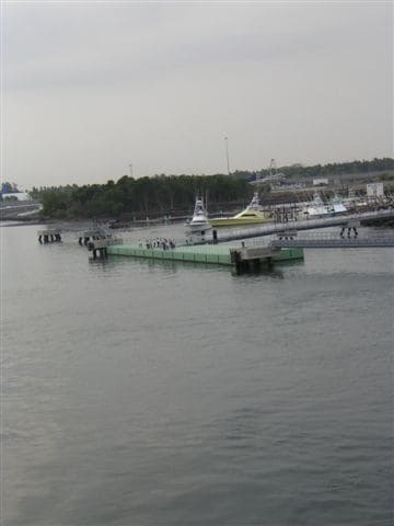The green pontoon is connected with a movable catwalk to the terminal village ashore.