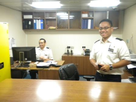 The Crew Office on B deck. With the Crew officer Mr. Maman Maruf sitting behind the desk and the Crew clerk Mr. Pangeran Manalu standing. To the left is just visible the yellow safe for all the crew passports and seamans books.