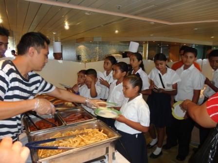 In the meantime a school class arrived at the ship, to be entertained by the Club Hal staff and to be wined and dined on hamburgers, ice cream and other goodies. As the Customs issue was still not solved, the Hotel Director had a brain wave; If we cannot donate to the school, maybe we can donate to the school children directly. That seemed to work and 30 little pupils marched happily off the ship, each carrying a bit of the school supplies back to the school and all was well in the world.