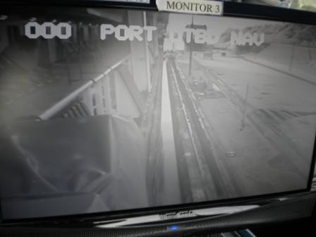View from the bridge; visual view lining the lifeboats up steady over the lock wall, and peeping under the lifeboats by camera to ensure the 2 feet clearance from the lock wall.