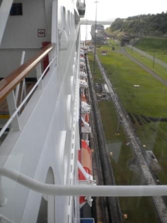 waiting area which was in the middle of the normal Canal anchorage. A lot of cargo ships crews suddenly and un-expectedly had a fully lit up cruise ship steaming by. Always a nice thing to liven up your boring anchor watch. The pilot hopped on board shortly after and then it was time to locate the Panama Canal Clearing Agent to get the paperwork done that would allow us to enter the Canal. As was the same last time, he was stuck on another ship and thus we steamed slowly towards the Canal while awaiting him. He finally showed up on time and we just got the final stamp placed before the whole circus started with 2 more pilots coming and the Panama Canal crew for the first locks. In the meantime we sailed under the Bridge of the America’s in the dark but as the bridge and the whole port of Balboa next to it was lit up as a Christmas tree, it provided a very scenic panorama. With this early start we had the first locks just before sun rise and the next locks before it was getting real-Panama-hot. The sail through, through the lake, you can then see from the leisure of your chair. Either on the balcony or from a public room or the Lower Promenade deck where we have the steamer chairs.