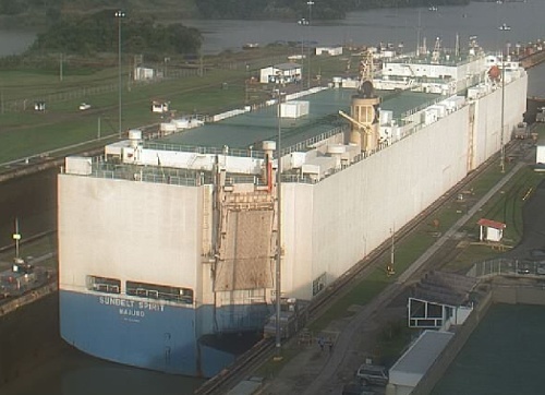 The Sunbelt Spirit in the Panama Canal. A car carrier is a floating garage and has roughly the same dimensions. A ramp at the stern and in the side give access to the car decks. This one can probably take about 3000 cars.