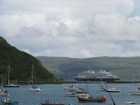 There we sat until day light came when we lowered the tenders for the guests to go ashore. Famous tours are to Dunvegan Castle and scenic drives over the island. I was glad that I had picked the outer anchorage as the weather indeed improved. The sun came out and the wind shifted to the North East and thus pushed the Prinsendam away until it lay behind its stretched anchor chain.