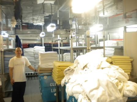 Mr. Sandy Diklirah has one of the largest store rooms on board under his control from where all linen is issued. He is part of the Housekeeping department and reports via the Laundry Manager to the Exe. Housekeeper. There is a turnover on linen, due to the frequent washing, regular wear and tear and with occasional guests, and crew alike, carrying out tests on the “tear apart factor” of the sheets and towels. Roughly $ 40,000 a year is needed for replacement and upkeep of the standard stock of a 1200 bed ship. Linen and towels that are beyond regular use are being cut up in handy sizes and given to the Engine Room where they are used for cleaning purposes.