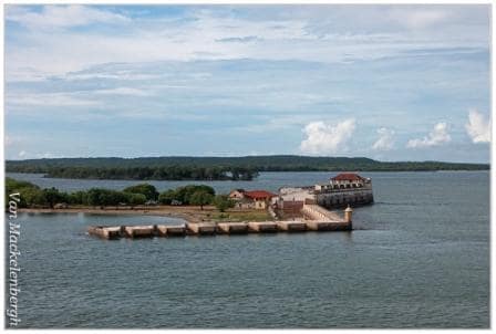 The channel to the entrance of Cartagena Bay is protected by a fort, San Luis, on either side of the fairway. It is quite famous as a big battle took place here between the English and the Spanish. Courtesy Hotelmanager Statendam