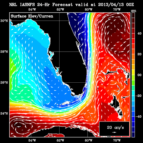 The flow of the Gulfstream as indicated by the flow direction and the temperature.