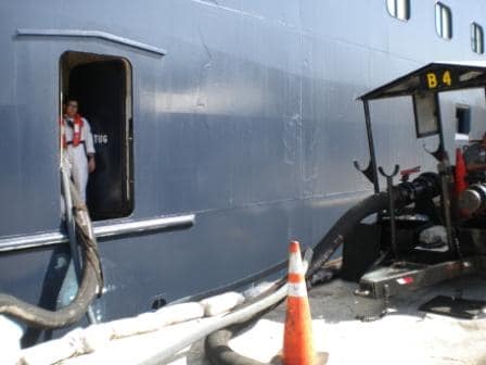Fuel loading in Fort Lauderdale. Here we do not use barges but a shore side pipe line system. At the pier a pump manifold regulates the loading pressure and from there it goes on board. A licensed engineer is constantly present to overview the situation so that no spills will occur.