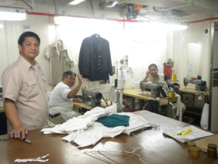 In my series of “Un-sung heroes” today we visit the Tailor shop. Since we stopped having a fixed home port (Rotterdam until 1971) the Holland America Line ships have carried Tailors on board its ships. They all come from the Philippines and each ship carries 3 or 4 on board. Their function is various. A. they maintain and mend all the uniforms in use; B. they make new uniforms for those who are boarding the ship; C. they man the tailor store for handing out uniforms (those homemade and those bought in bulk from outside such as safety shoes, coveralls and khaki uniforms) and D. they work on projects for the future or for other ships.
