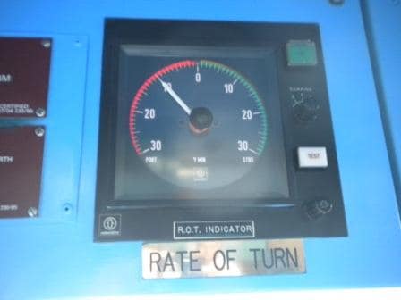 You can also calculate the number of degrees that you have to change every minute to get to your next course when the ship moves forward. If you have a speed of 10 knots, apply 10 degrees rate of turn per minute and it will take you exactly 36 minutes to make a full circle, with a radius of 1 mile. If you have to make a tighter turn, then you have to increase your Rate of Turn, or slow down. We have a meter on the bridge that shows us how fast the ship is turning, e.g. how much Rate of Turn it makes.