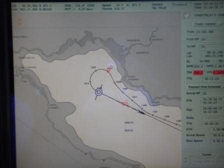 We do the whole scenic tour in about 2.5 hours and it is all done by the navigator on duty. A Highlight is making the perfect turn. When we change course from 350 degrees to 120 degrees to go back, the challenge is to make a perfect half circle. For that we use Rate of Turn, which I mentioned yesterday. You can go around the corner by applying the rudder, eyeball the situation, and when you almost there, apply counter rudder and then stop the turn on the course that you like. That might need several rudder orders while making the turn.