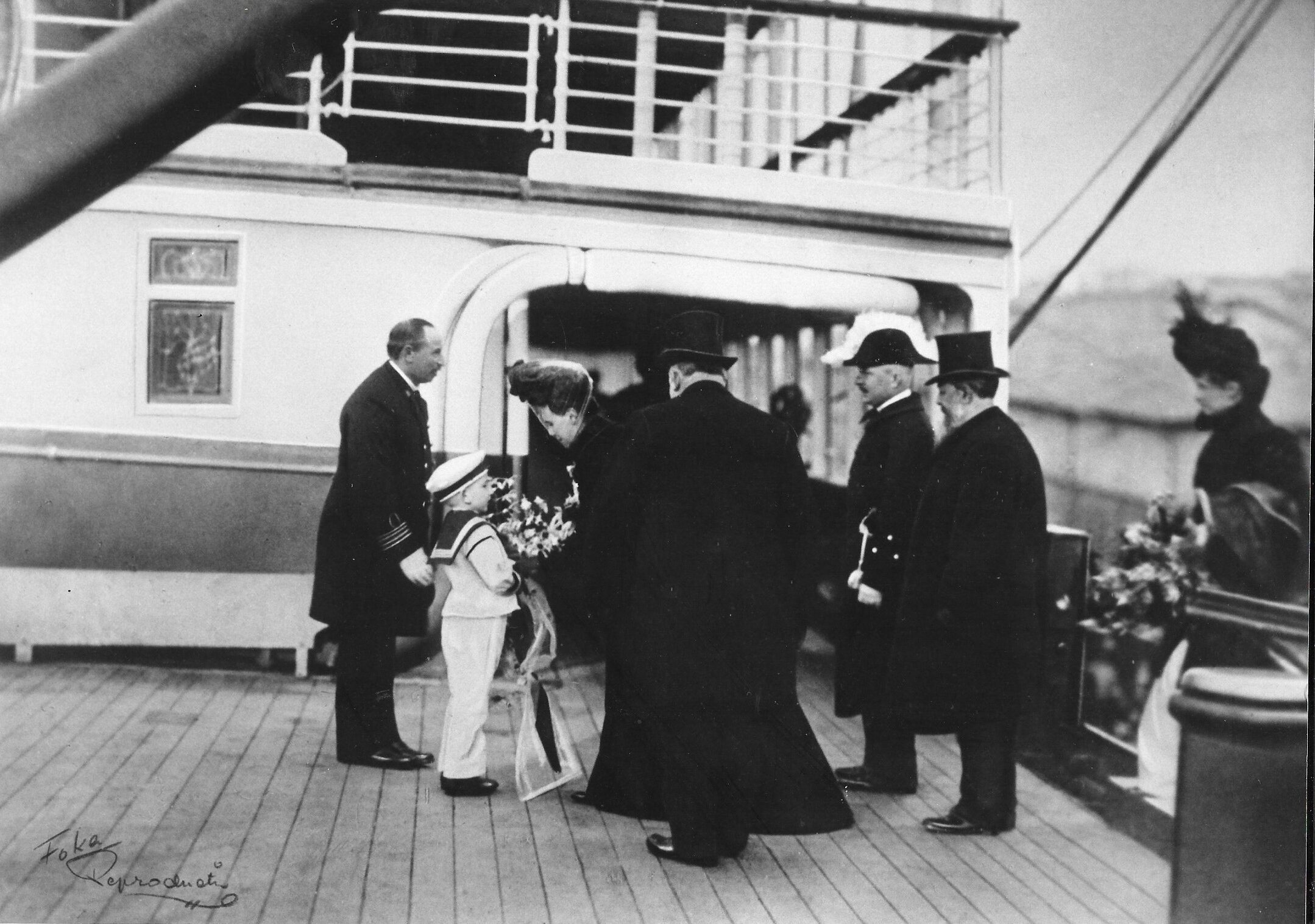 Captain Stenger welcomes Queen Wilhelmina and her husband on board the ss Potsdam in Rotterdam. (b) (This photo also exists as a postcard in a series commercially issued to honour the visit to Rotterdam) (b,d)