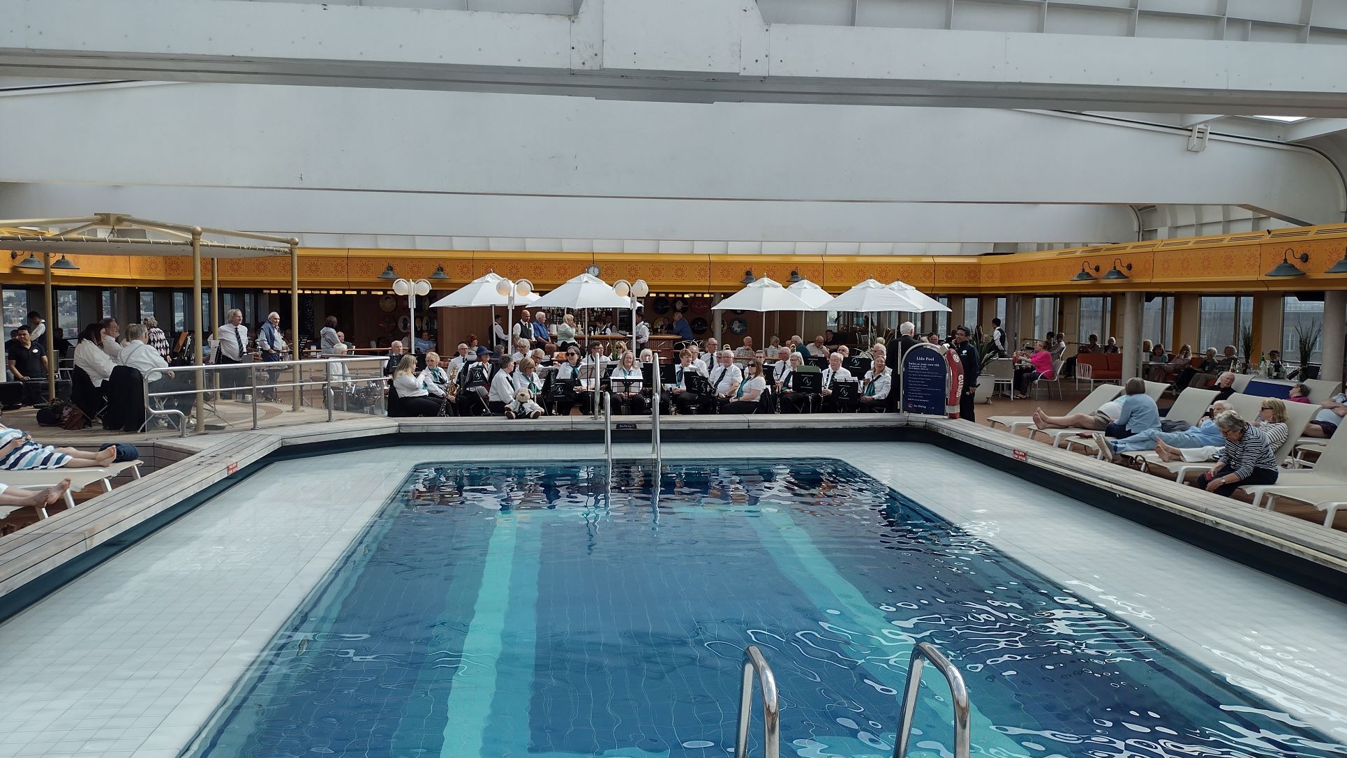 Then it was time to run to the Lido Deck, as the Urbu Band was playing. This is a British Brass band that has been performing for the 8th time on board. As far as I understand they are offered a discounted cruise, when a ship does not sell out, with the request for 2 performances. Good to sit and nice to listen to. There is something different and also wholesome in having a somewhat different entity playing that is not corporately managed and “plastic”, but are just purely playing for the fun of it.
