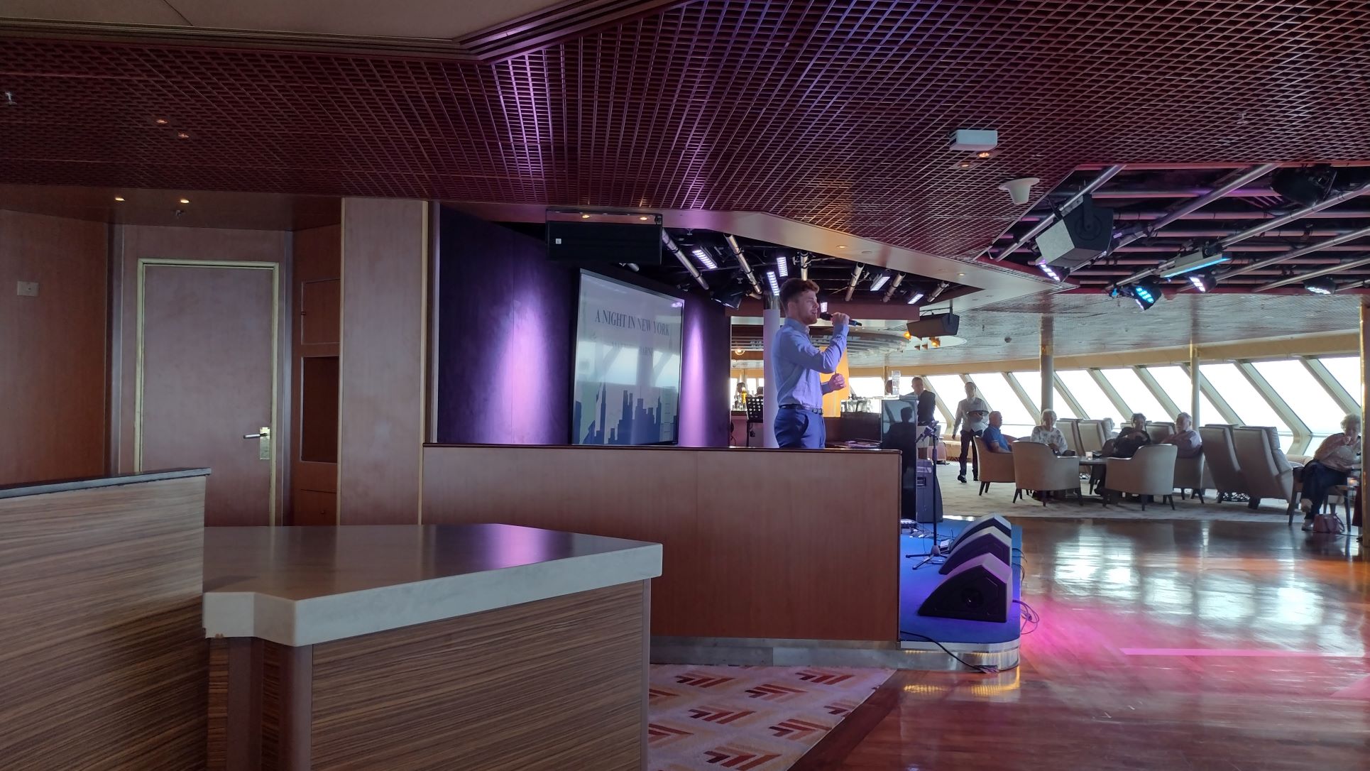 After finishing packing it was time to go for cocktails and in the Observation Lounge one of the ships singers was giving a show, with songs from Frank Sinatra and related. It was very good, and fun to see as a beaming mother was sitting in the first row.
