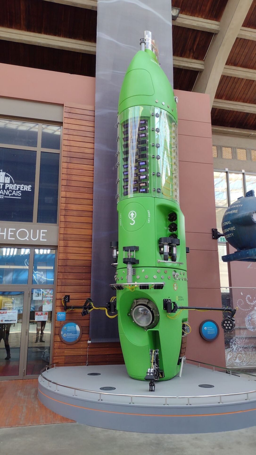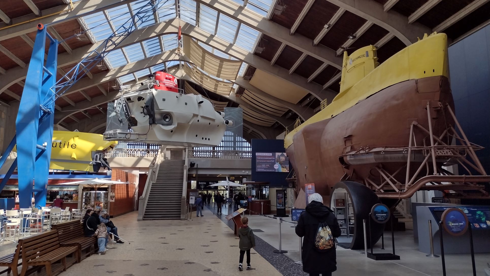 The museum is forever expanding, so when we visit next time, will we probably buy a ticket go inside again. We did so a few years back and the deep seawater tank and the explorers submarines and other exhibits were fascinating. They have now also opened up an Virtual Reality exhibition, where with a headset on, you walk through the ocean terminal in the heyday of Trans Atlantic travel and can experience what it really was like. For the young and young at heart they have set up a display based on the French Comic heroes Asterix & Obelix which are very popular in France, Belgium, The Netherlands but also in England and Germany. But even when not going inside the museum, there is so much equipment in the entrance hall, that it takes more than half an hour to have a look at all of it. The sometimes bizarre contraptions humans use and have used to get to the bottom of the ocean. It is said that we know more about the moon than about the oceans on our planet but if you look at the gadgets needed to go to the sea floor, I am not amazed.