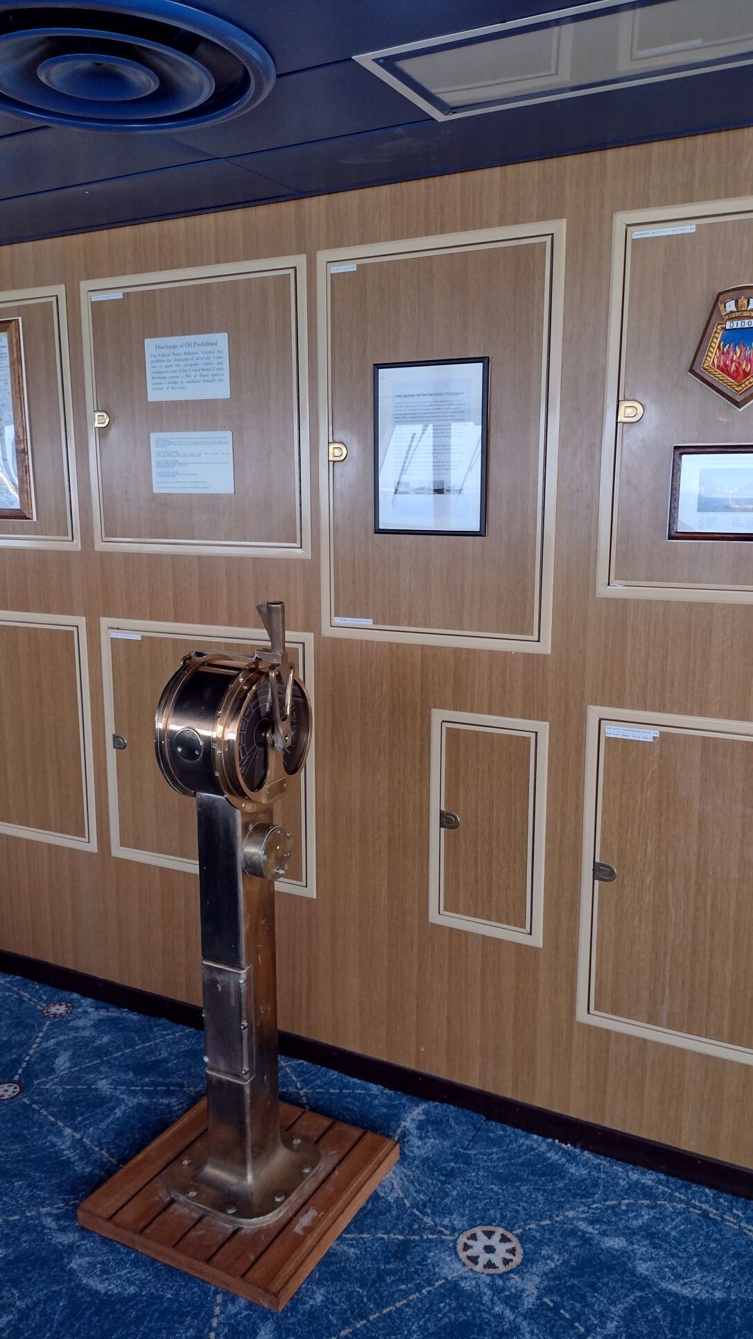 The ships telegraph on the bridge. Now used for photos during bridge tour. It is orginally a mooring telegraph from the Moore McCormack days and came via the Veendam (III) and the Rotterdam (V) to the Rotterdam (VI). The write up is behind the telegraph so those who bother can find out about the history.