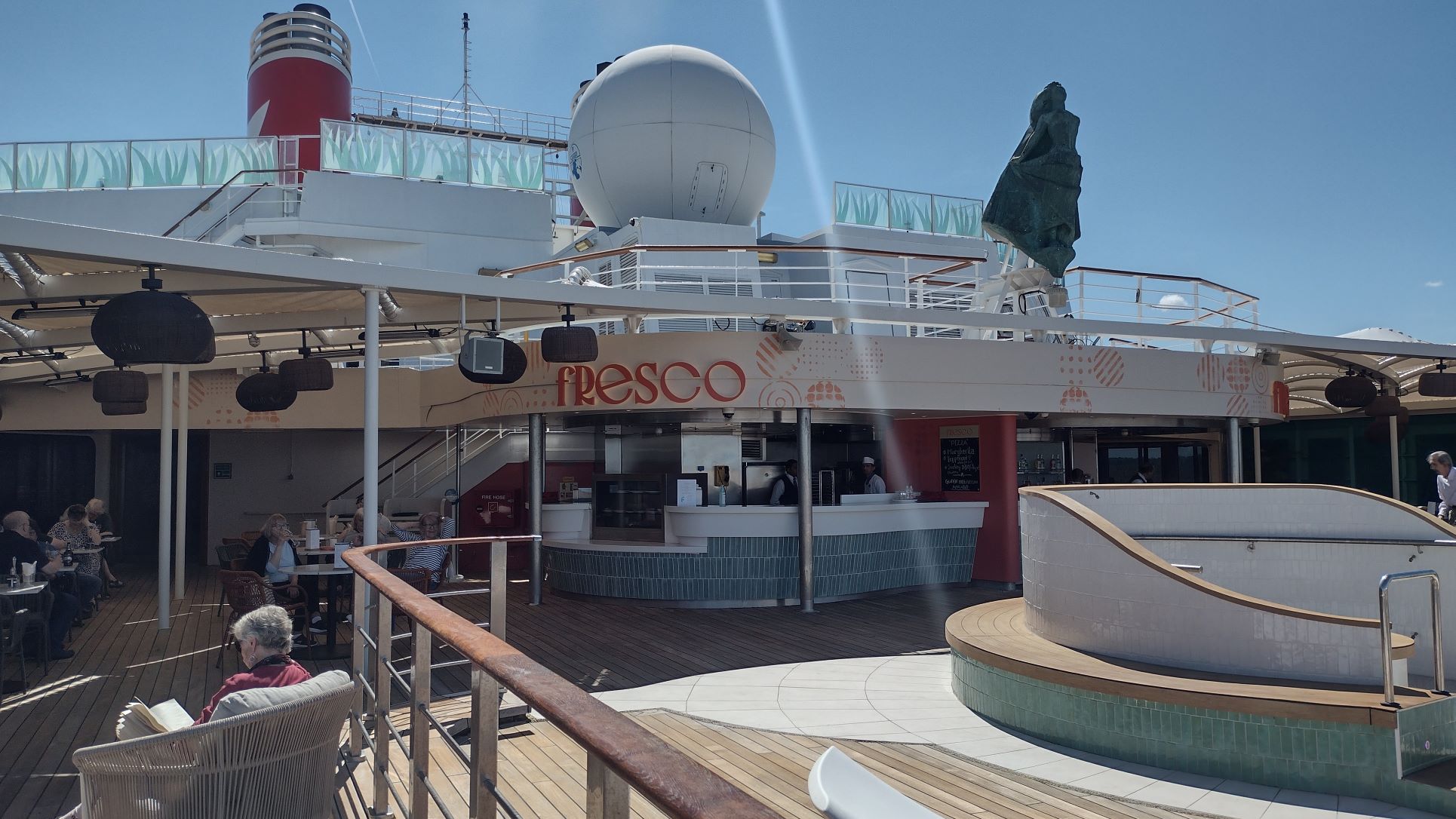 A final nice touch, as least for shippy people. Fred Olsen ships always had a bronze bow figure. If a ship left the company,then the figure was taken off and stored in the garden of the Olsen house on the OsloFjord until it was needed again. With the Borealis and Bolette it does not look good to put one on the bow, so they have one on the Aft Lideo Deck. I still have to find out from which ship this one once came.